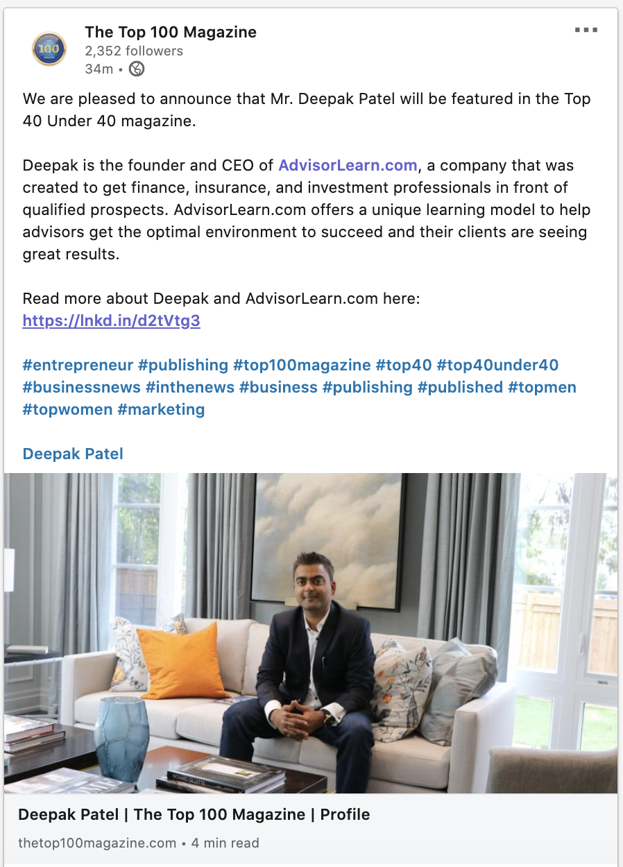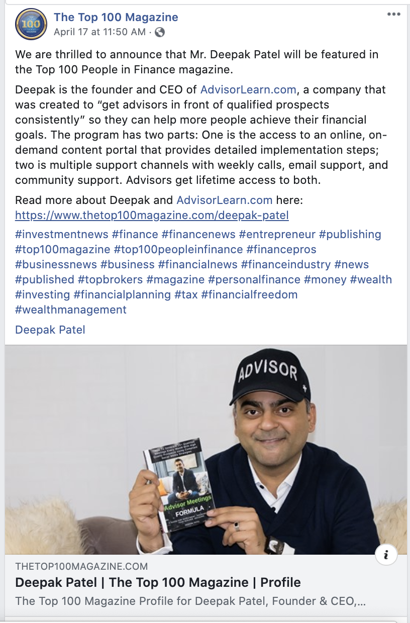 Deepak and his flagship AdvisorLearn.com platform has helped over 500 Financial Advisors and Insurance Agents to build a "powerful" and "compliant" social media strategy that produces "consistent appointments and clients" and builds a thriving "new age" financial practice and changes lives with financial literacy and education.