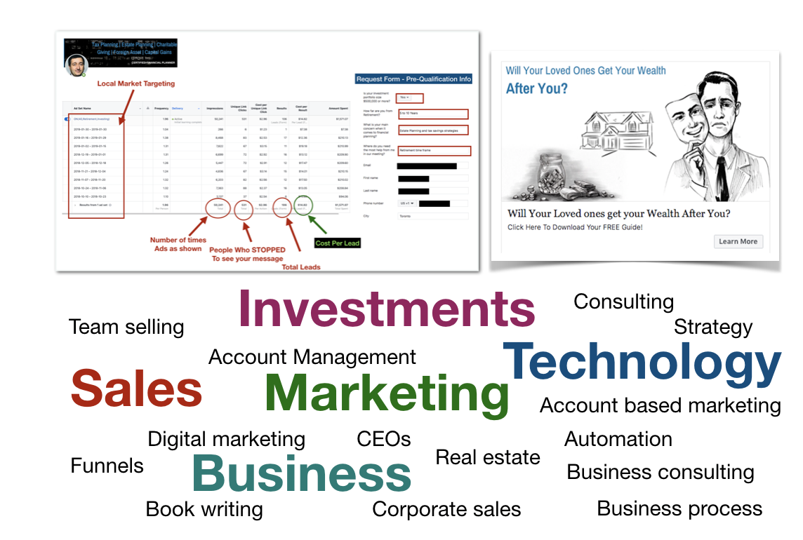 While I was doing this, my Financial Advisor came to me one day and he started to tell me his struggles to get meetings with high net worth individuals ($500K+ asset). I learned that he was not using any social media strategy and I told him what I was doing. He immediately became a client and I created a Facebook Ad campaign for him that took me like 1 hour. In a few weeks, we generated over 100 leads, 6 meetings and one person had $6.5 Million assets.